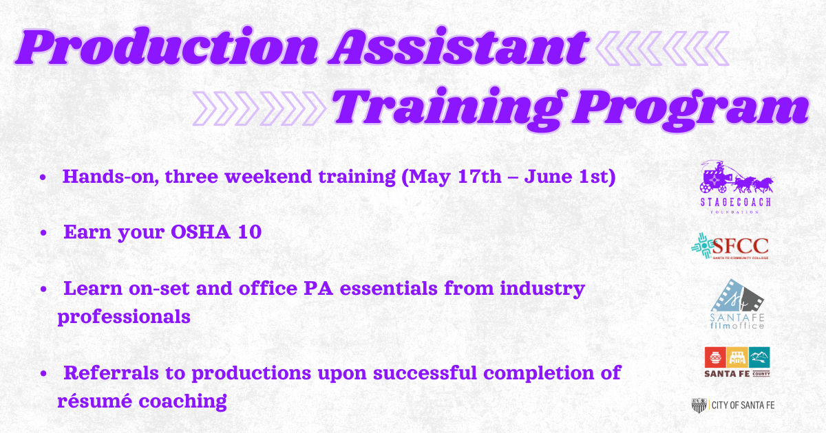 Stagecoach Foundation, Inc., in partnership with Santa Fe Community College’s (SFCC) Film Department, is preparing for its fifth free Production Assistant Training for Film and Television. This hands-on training is designed for New Mexico residents interested in breaking into the film and television industry. Sessions will take place across three weekends, starting May 17 and concluding on June 1, at the SFCC campus, located at 6401 Richards Avenue in Santa Fe.